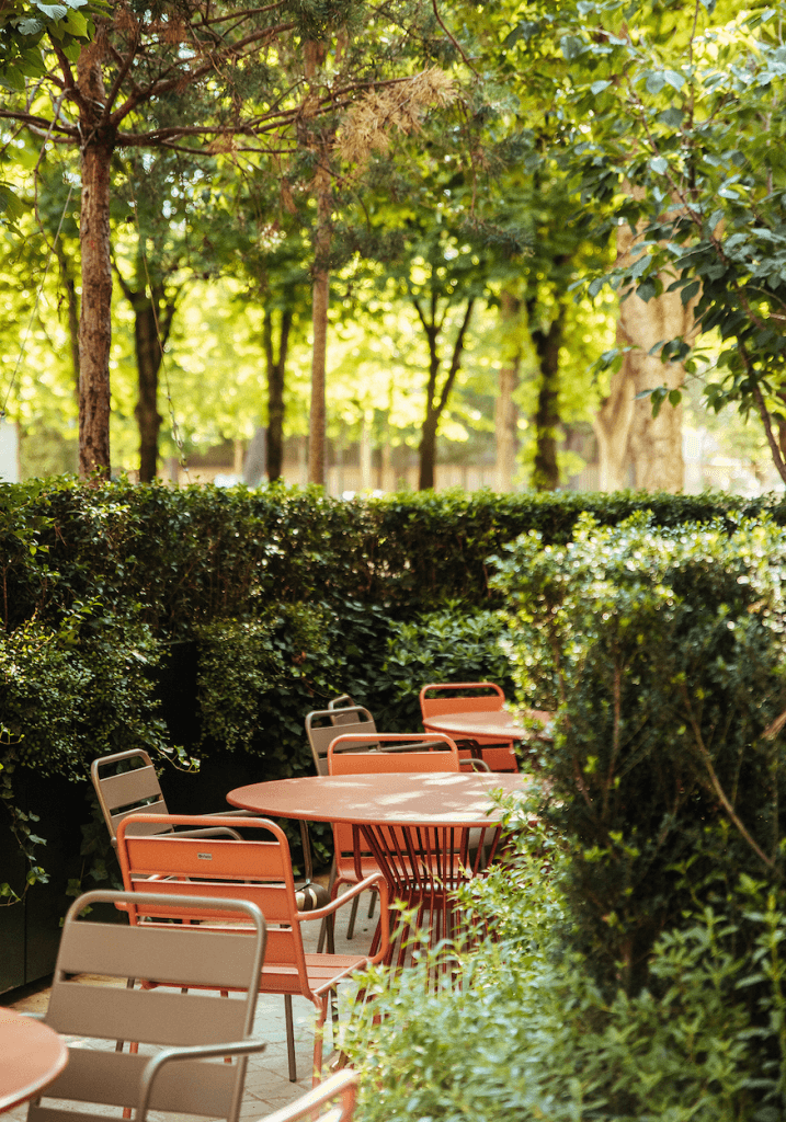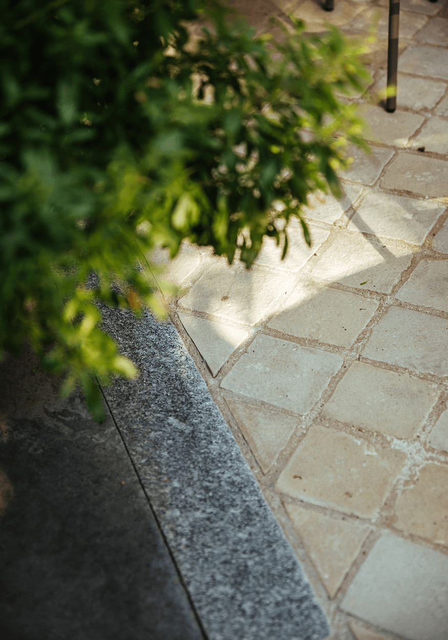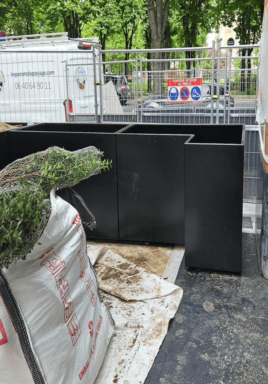 Pour cette terrasse de restaurant d’entreprise, Les Garçons du Paysage ont entièrement repensé l’espace, de la chaussée aux plantations. Après la dépose de l’existant, une structure en grave 0/31.5 a accueilli 180 m² de pavage en grès scié Kandla beige, bordé de granit. Des jardinières en acier thermolaqué noir, conçues sur mesure,intègrent un arrosage automatique discret. Les poteries Ateliers Vierkant et le mobilier sur mesure complètent l’ensemble. Arbres de grande hauteur, arbustes, vivaces et bulbes profitent d’un substrat riche en nutriments. Un contrat d’entretien hebdomadaire garantit propreté, taille raisonnée et suivi des arrosages tout au long de l’année.